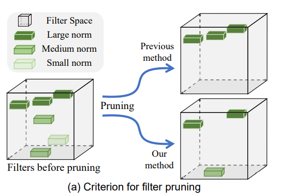 이 논문에서는 이 두 문제에 상관없이 모델을 압축할 수 있는 새로운 filter pruning method(Filter Pruning via Geometric Median, FPGM)를 제시한다.