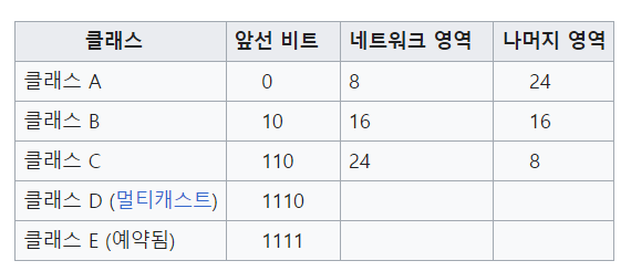 CIDR 기법이 도입되기 전엔, 아래 그림과 같이 앞선 비트 (시작 위치의 비트)에 따라 클래스가 나뉘어져 각 클래스에 맞게 네트워크 영역과 호스트 영역을 구분하는 방법인 네트워크 클래스 기법을 사용했습니다.
