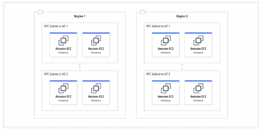 위 다이어그램은 리전 1 안에서 네트워크 트래픽이 가용 영역 1의 VPC와 가용 영역 2의 VPC 간에 공유되는, 가능한 구성을 보여줍니다. 동일한 아키텍처가 리전 2에도 표시되어 있습니다. 이 예제에서 리전 1과 2의 VPC는 서로 연결할 수 없습니다.