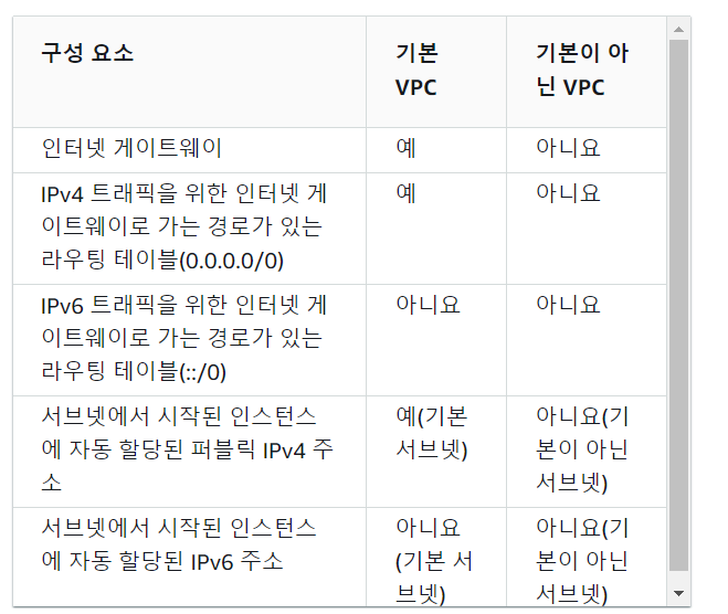 기본 VPC와 기본이 아닌 VPC에 대한 인터넷 액세스는 아래 표에서 확인할 수 있습니다.