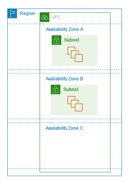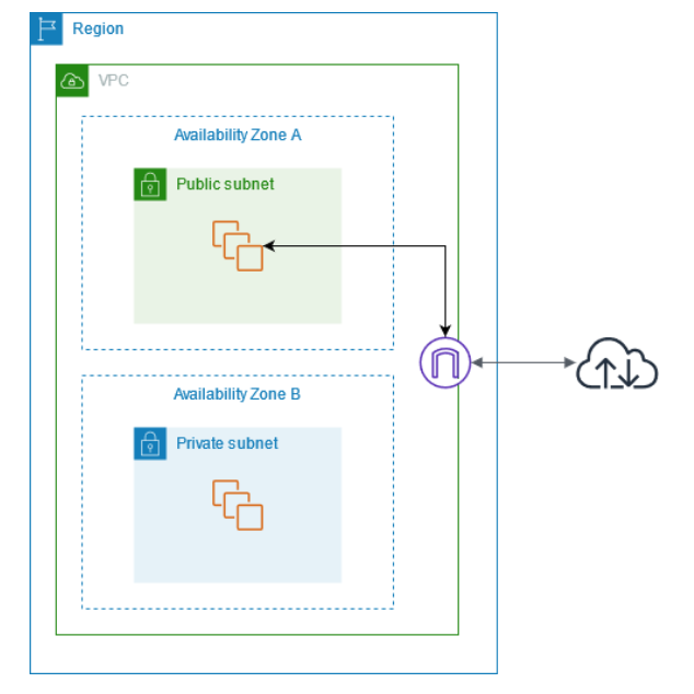 아래의 다이어그램은 VPC의 예시입니다. VPC에는 리전의 각 가용성 영역에 하나의 서브넷이 있고, 각 서브넷에 EC2 인스턴스가 있고, VPC의 리소스와 인터넷 간의 통신을 허용하는 인터넷 게이트웨이가 있습니다. 이 다이어그램에 나온 개념들에 대해 하나씩 정리해 보도록 하겠습니다.