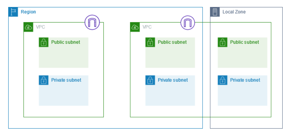 위 다이어그램에서는 한 리전에 있는 2개의 VPC를 보여줍니다. 각 VPC에는 퍼블릭 및 프라이빗 서브넷과 인터넷 게이트웨이가 있습니다. 다이어그램에 표시된 대로 필요에 따라 로컬 영역에 서브넷을 추가할 수 있습니다. 로컬 영역(AWS Local Zones)은 컴퓨팅, 스토리지 및 데이터베이스 서비스를 최종 사용자에게 더 가깝게 배치하는 AWS 인프라 배포입니다.