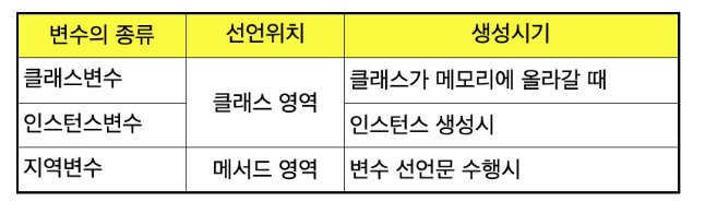 - 클래스 변수: 멤버 변수 중 static 키워드가 사용된 변수