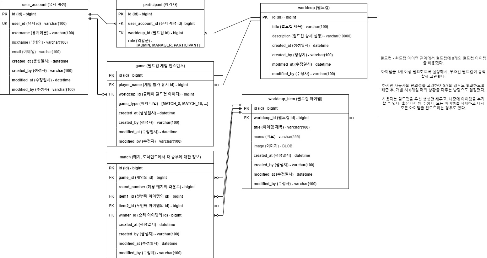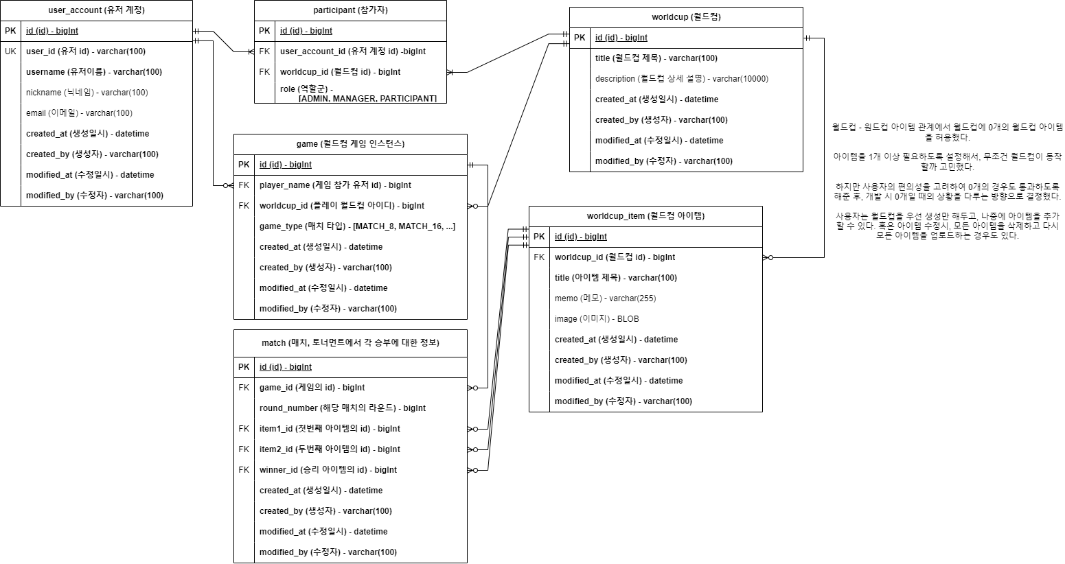 participants 테이블은 user_account - worldcup 테이블의 다대다 관계를 분리하기 위하여 생성된 테이블입니다. game 테이블은 월드컵 정보를 토대로 생성된 게임 인스턴스입니다. match 테이블은 플레이어가 선택한 모든 월드컵 기록을 저장하는 테이블입니다.