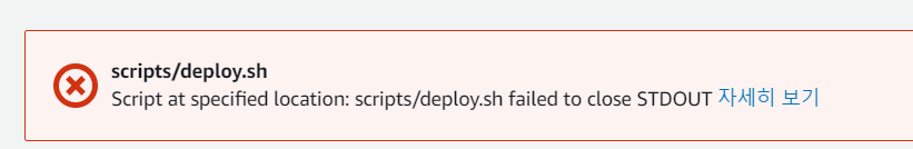 그런데 code deploy에서 계속 배포 실패가 되었습니다. 에러 로그는 "Script at specified location: scripts/deploy.sh failed to close STDOUT", 즉 표준 출력이 제대로 닫히지 않고 있다는 거죠.
